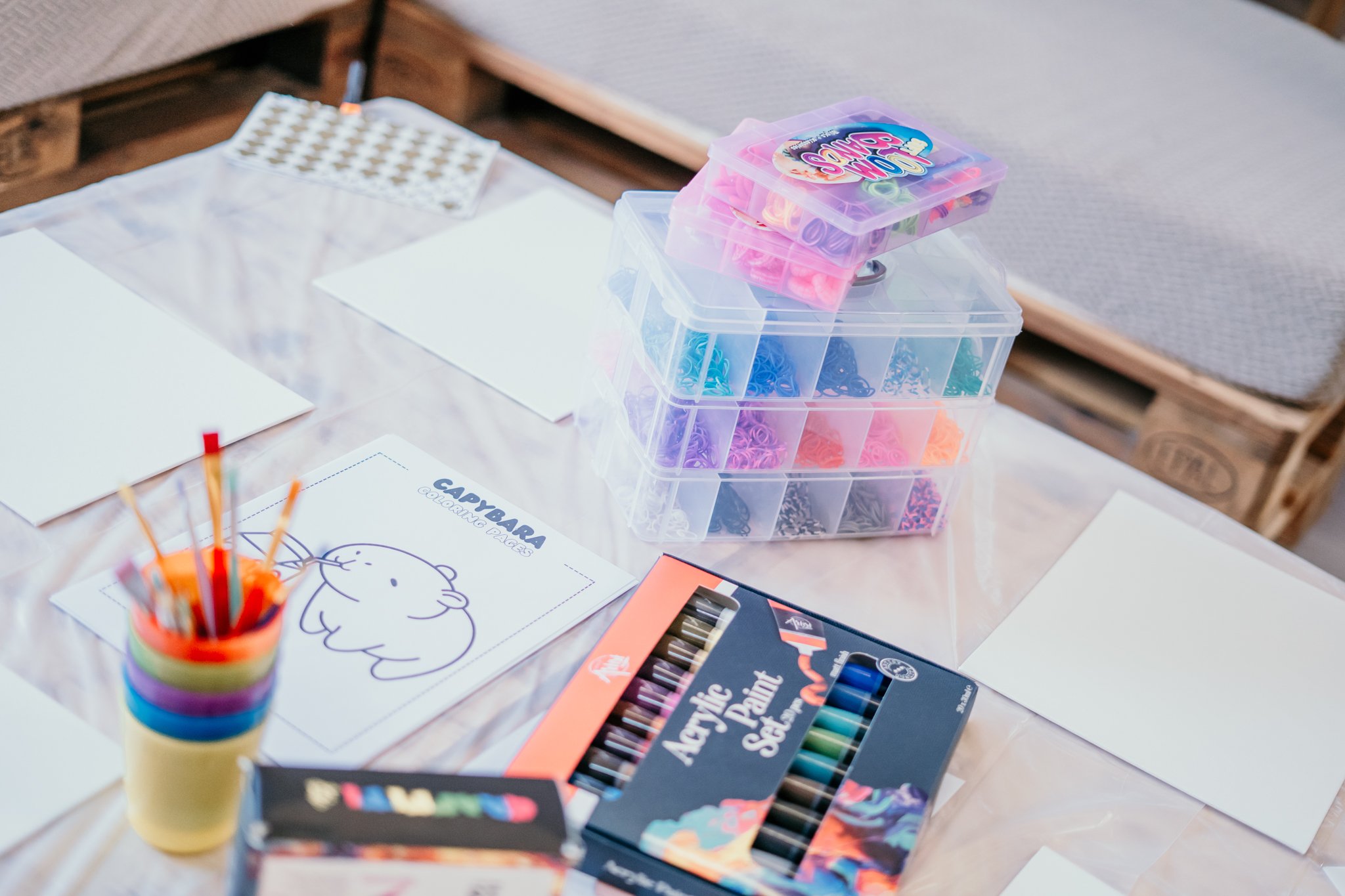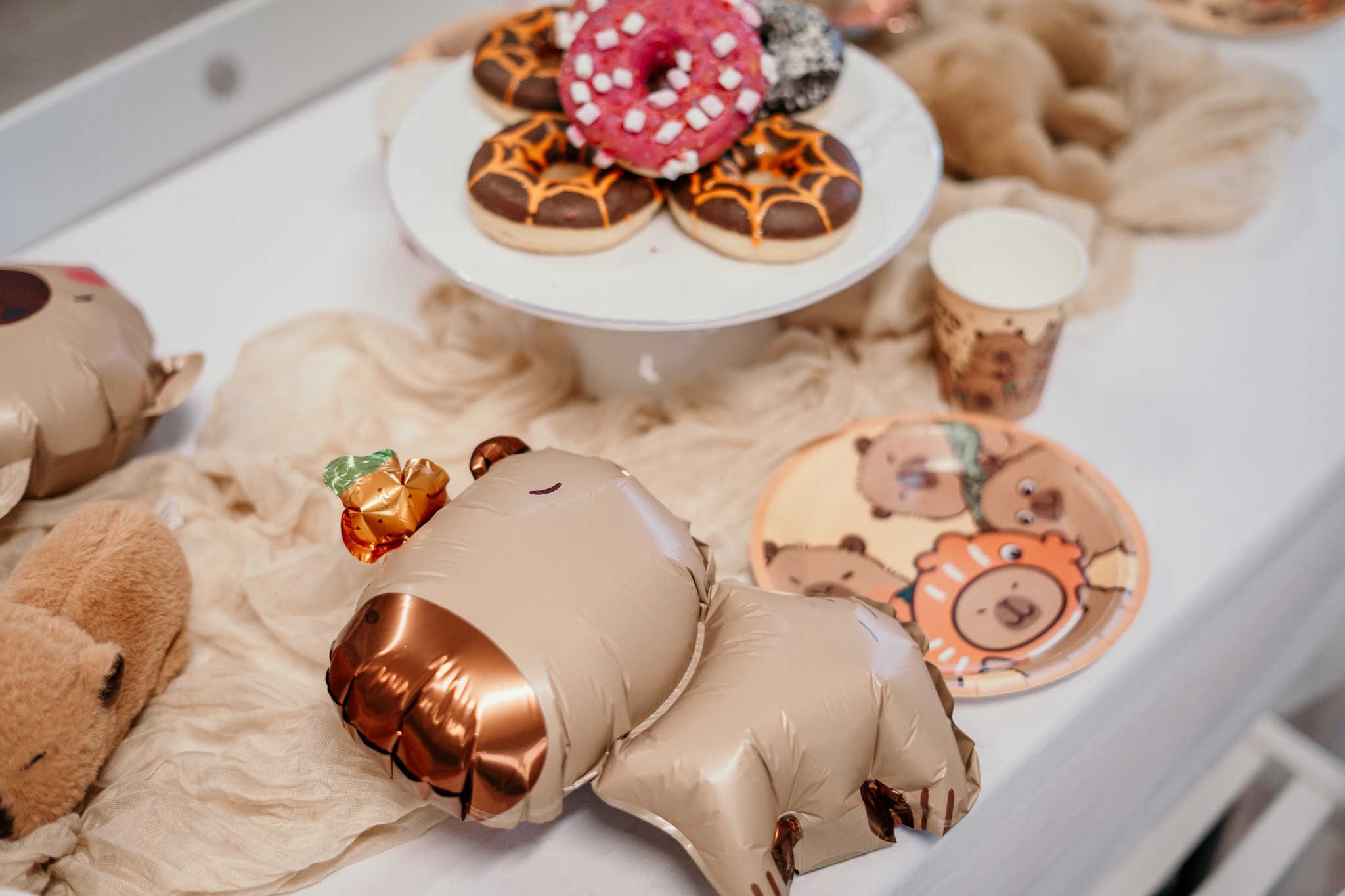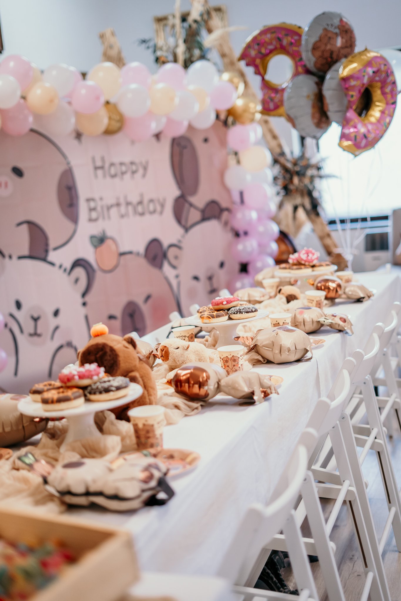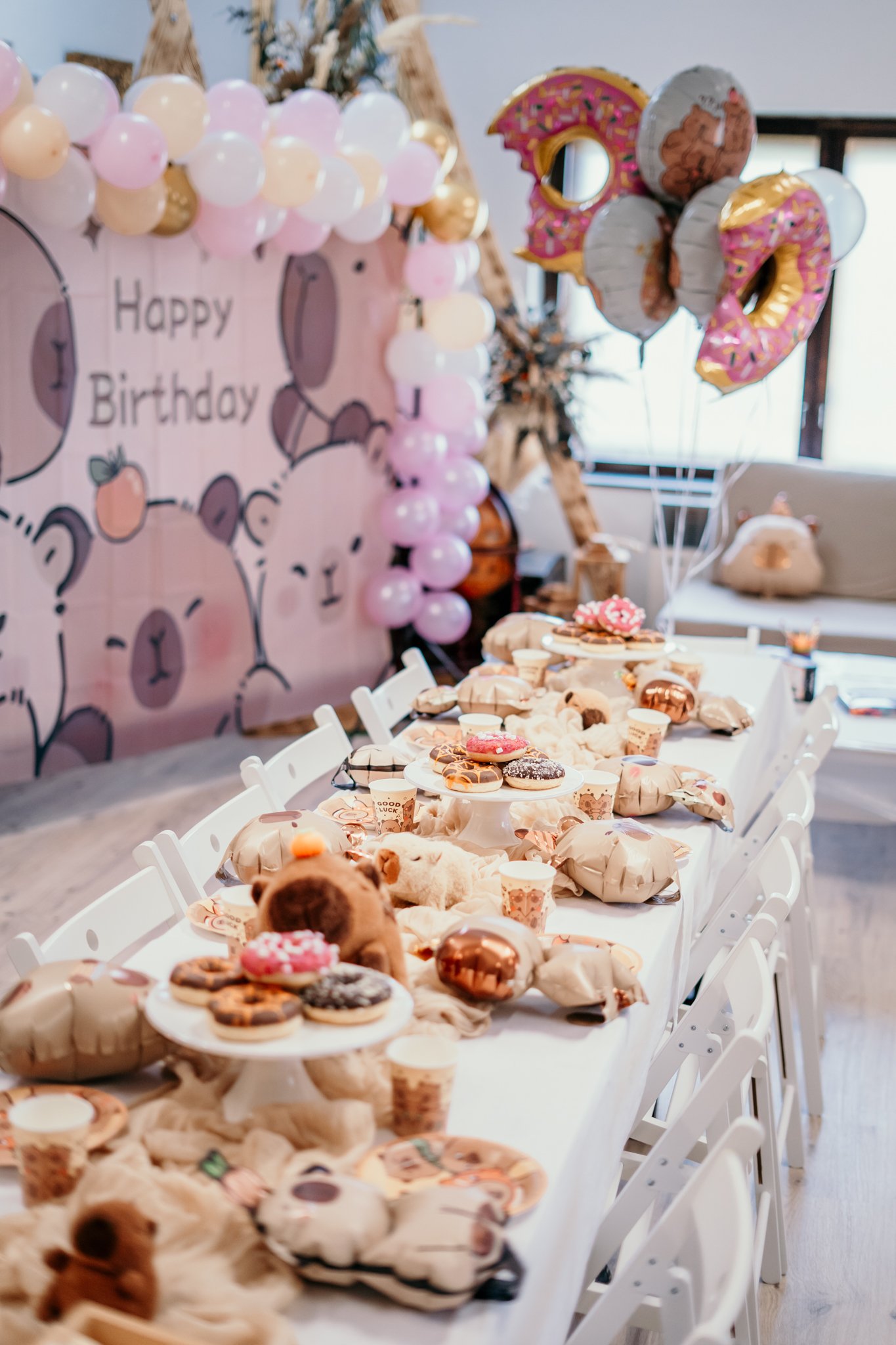 Prostor je vybaven gaučem s konferenčním stolkem, dětským koutkem, třemi nízkými stolky a stoličkami k sezení. Výzdobu pro vás připravíme dle zvoleného tématu nebo barevného ladění.